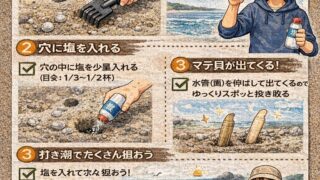 潮干狩りで「マテ貝が全然出てこない…」と悩む人の多くは、塩の使い方・ポイント選び・潮のタイミングのどれかでつまずいています。この記事は、初めてマテ貝を狙う初心者〜家族連れでも再現できるように、マテ貝が塩で出てくる仕組みから、失敗しない塩の量...
