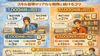 1,000時間・10,000時間は実際に何日かかるのかを、初心者にもわかりやすく解説。到達までのリアルな期間やスキル習得の目安、忙しい人でも続けやすい学習のコツまで紹介します。努力時間の目安を知りたい方に役立つガイドです。